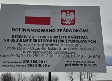 W ramach zadania związanego z usuwaniem skutków intensywnych opadów deszczu z 2025 roku na drodze publicznej gminnej Nr K270902 Gładyszów – Uście Gorlickie (obok Leśniczówki) wykonano nową nawierzchnię asfaltową na dł. 712m. Celem zadania była poprawa stanu technicznego infrastruktury drogowej dla polepszenia dostępności lokalnej społeczności do instytucji świadczących usługi publiczne w zakresie zdrowia, bezpieczeństwa, edukacji, opieki, administracji. Remont zrealizowano w okresie 28.10.2025 r. – 11.12.2025 r.