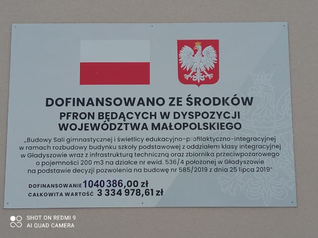 „Budowę sali gimnastycznej i świetlicy edukacyjno-profilaktyczno-integracyjnej w ramach rozbudowy budynku szkoły podstawowej z oddziałem klasy integracyjnej w Gładyszowie wraz z infrastrukturą techniczną oraz zbiornika przeciwpożarowego o pojemności 200 m³ na działce nr ewid. 536/4 położonej w Gładyszowie na podstawie decyzji pozwolenia na budowę nr 585/2013 z dnia 25 lipca 2019”