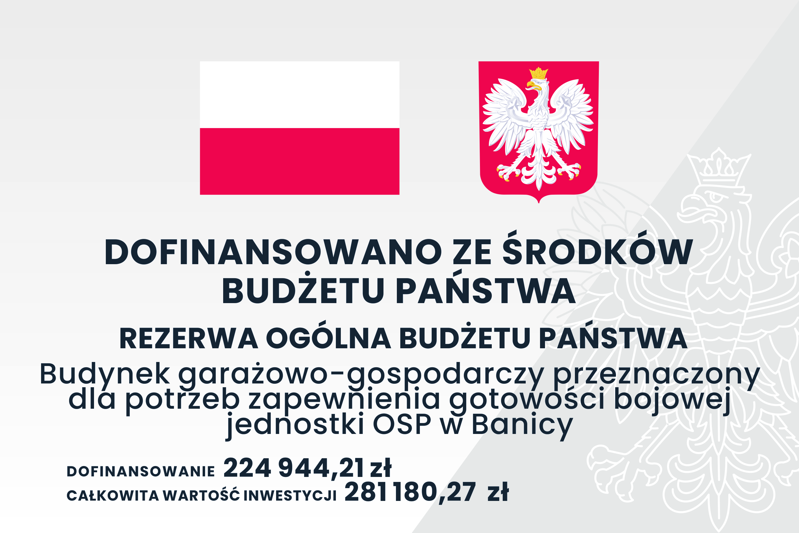 W Banicy został wybudowany budynek dla OSP Banica. Inwestycja była dofinansowana z rezerwy ogólnej budżetu państwa w kwocie 219 520,00 zł Łączna wartość inwestycji 288 820,70 zł.