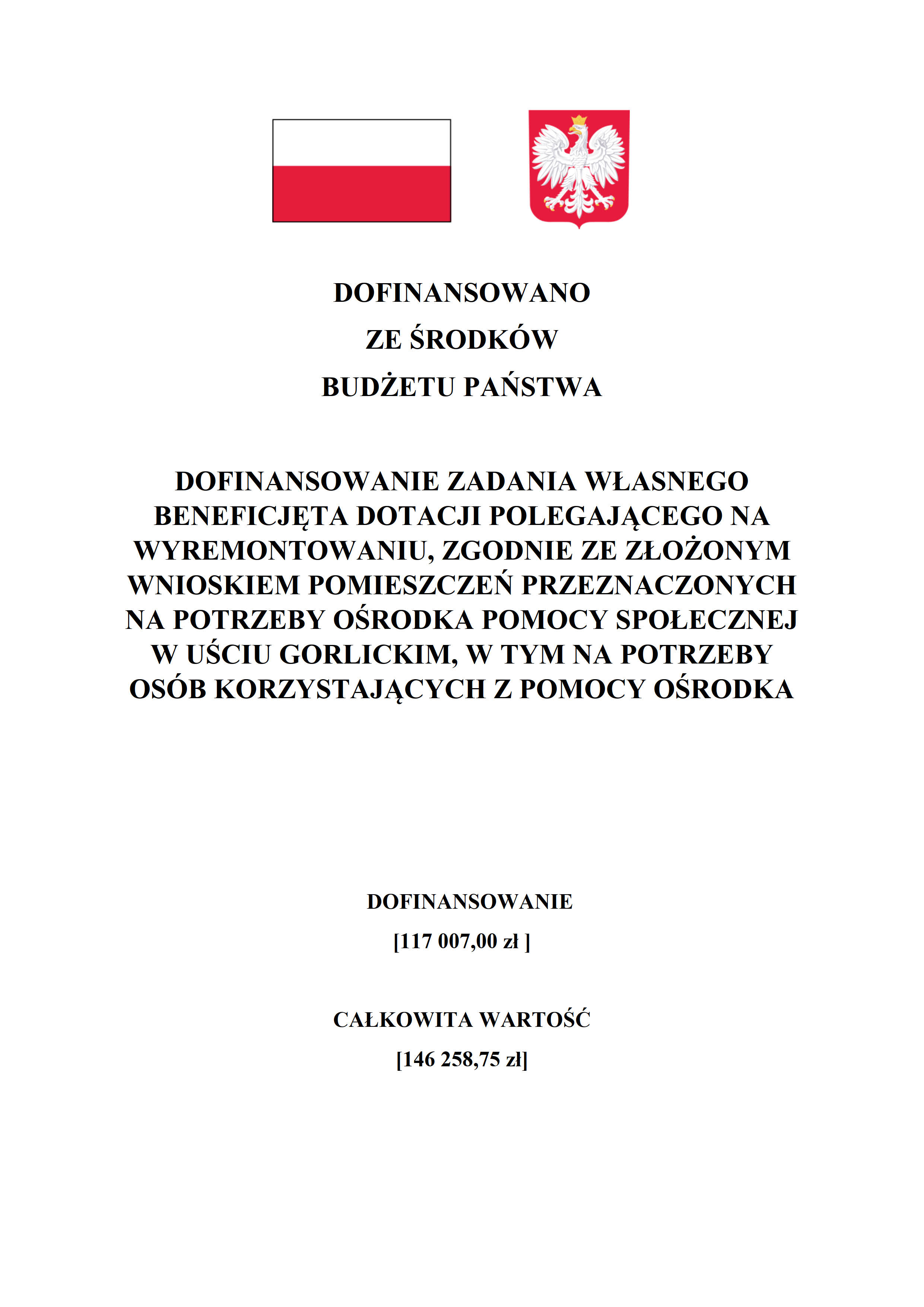 Dofinansowanie zadania własnego beneficjęta dotacji polegającego na wyremontowaniu, zgodnie ze złożonym wnioskiem pomieszczeń przeznaczonych na potrzeby ośrodka pomocy społecznej w uściu gorlickim, w tym na potrzeby osób korzystających z pomocy ośrodka