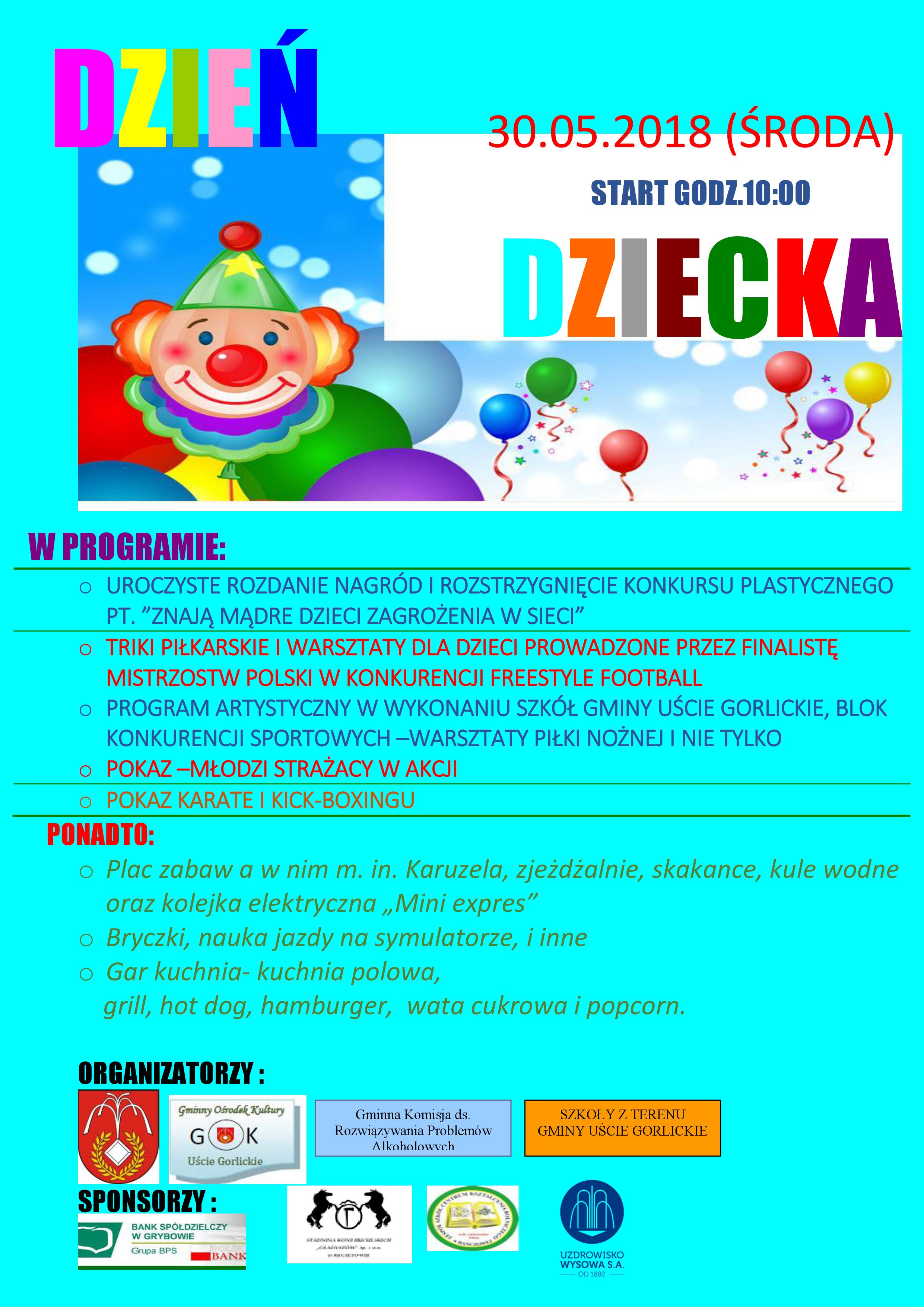 Wójt Gminy zaprasza dzieci i ich opiekunów na stadion sportowy w Uściu Gorlickim w dniu 30 maja 2018r. ( środa), na Gminny Dzień Dziecka.