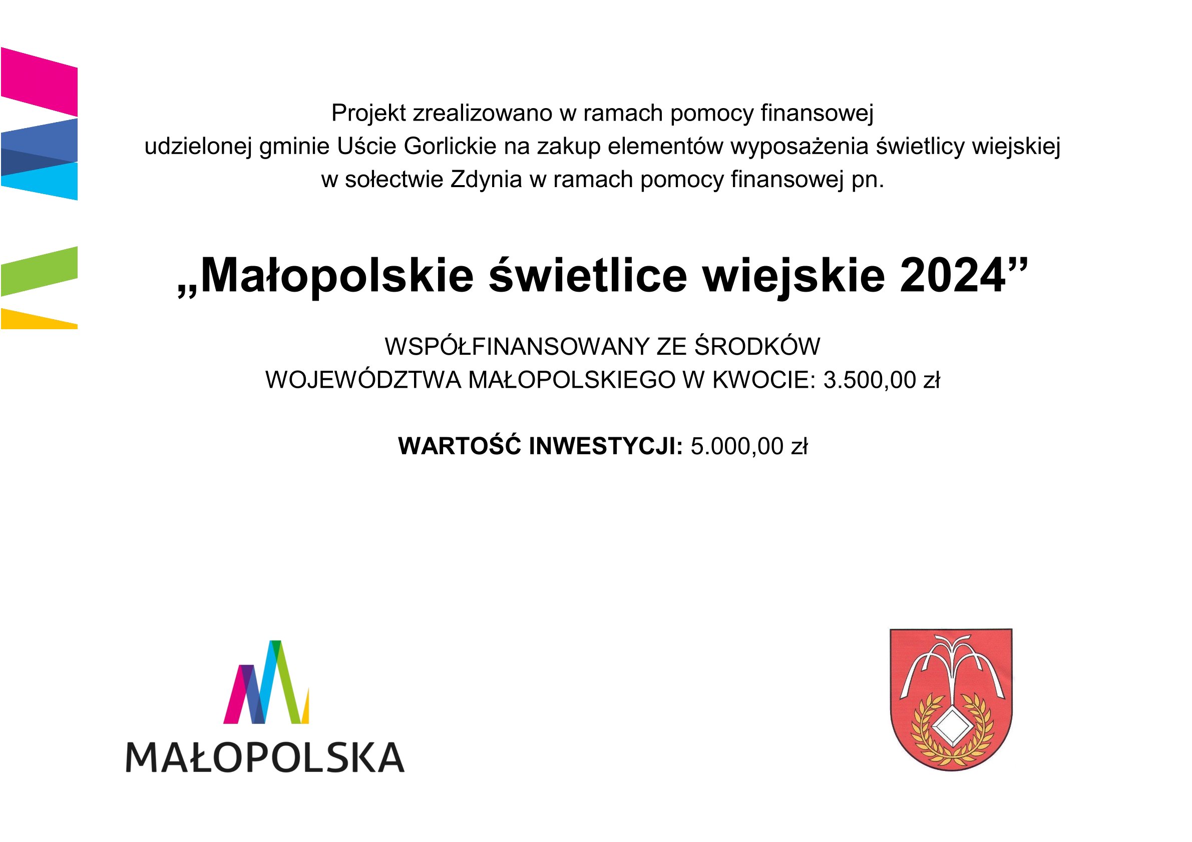 Zadanie współfinansowane ze środków Województwa Małopolskiego w ramach zadania pn. „Małopolskie świetlice wiejskie 2024”