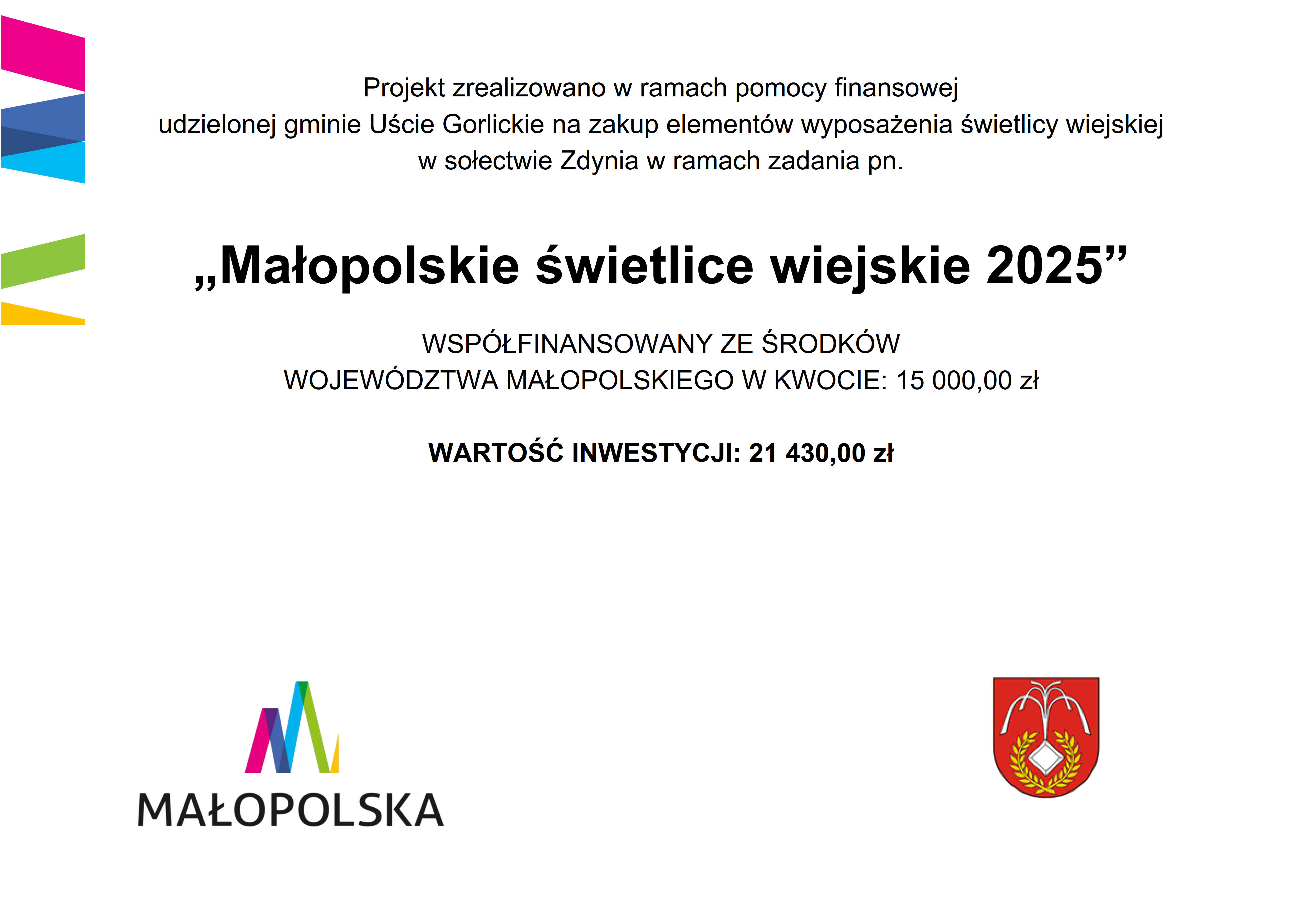 Projekt został zrealizowany w ramach pomocy finansowej udzielonej Gminie Uście Gorlickie na zakup wyposażenia do świetlicy wiejskiej w sołectwie Uście Gorlickie, w ramach programu pn. „Małopolskie świetlice wiejskie 2025”. Umowa o dofinansowanie została podpisana 10 czerwca 2025 r.