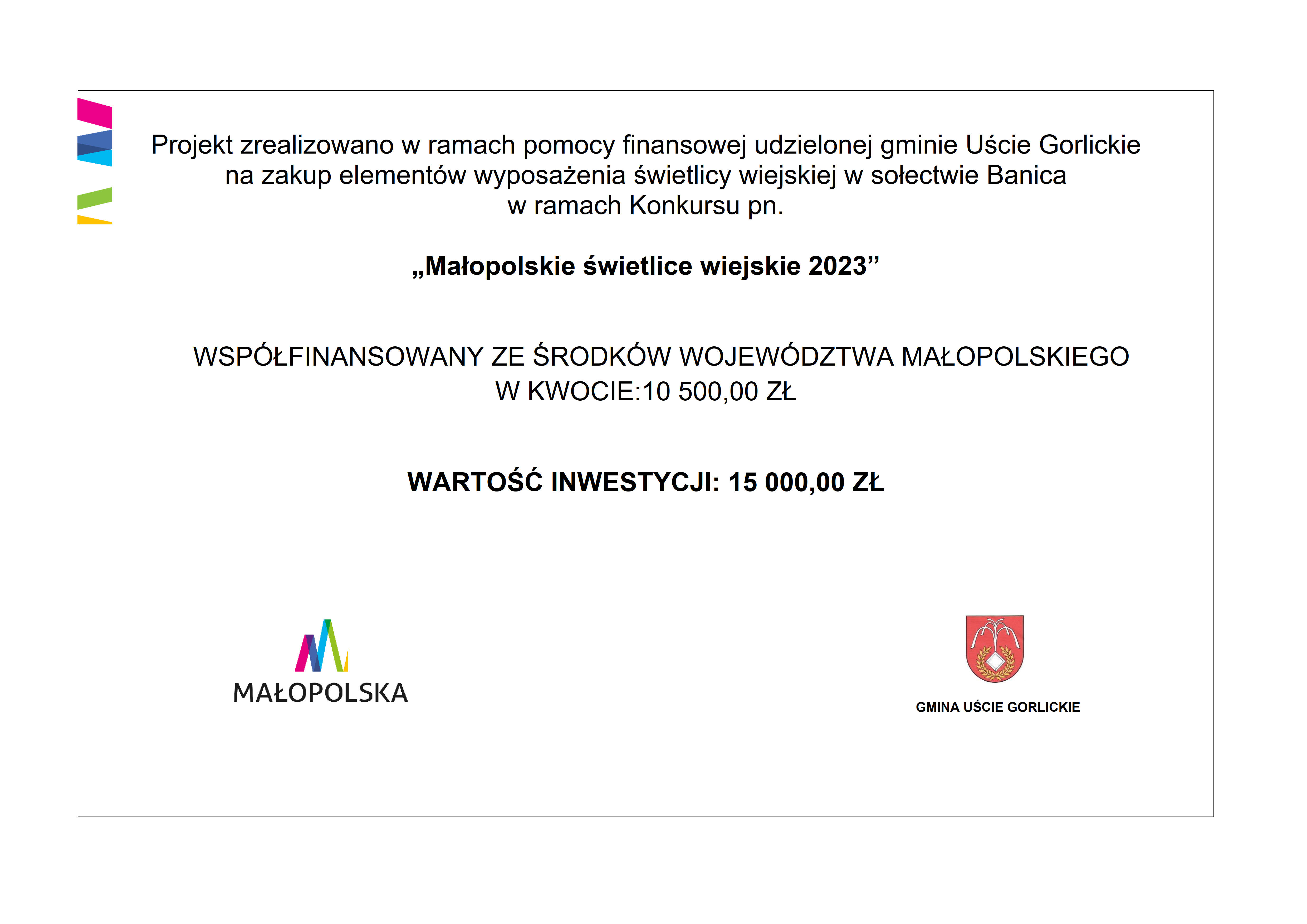 Projekt zrealizowano w ramach pomocy finansowej udzielonej gminie Uście Gorlickie na zakup wyposażenia w świetlicy wiejskiej w sołectwie Banica w ramach pomocy finansowej pn. „Małopolskie świetlice wiejskie 2023”