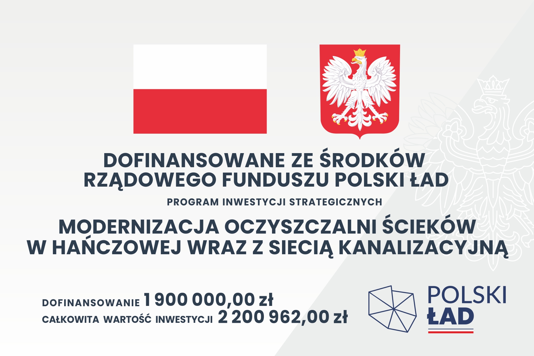 Inwestycja w Hańczowej polegała na modernizacji oczyszczalni ścieków wraz z siecią kanalizacyjną. Inwestycja była dofinansowana ze ŚRODKÓW RZĄDOWEGO FUNDUSZU POLSKI ŁAD.
