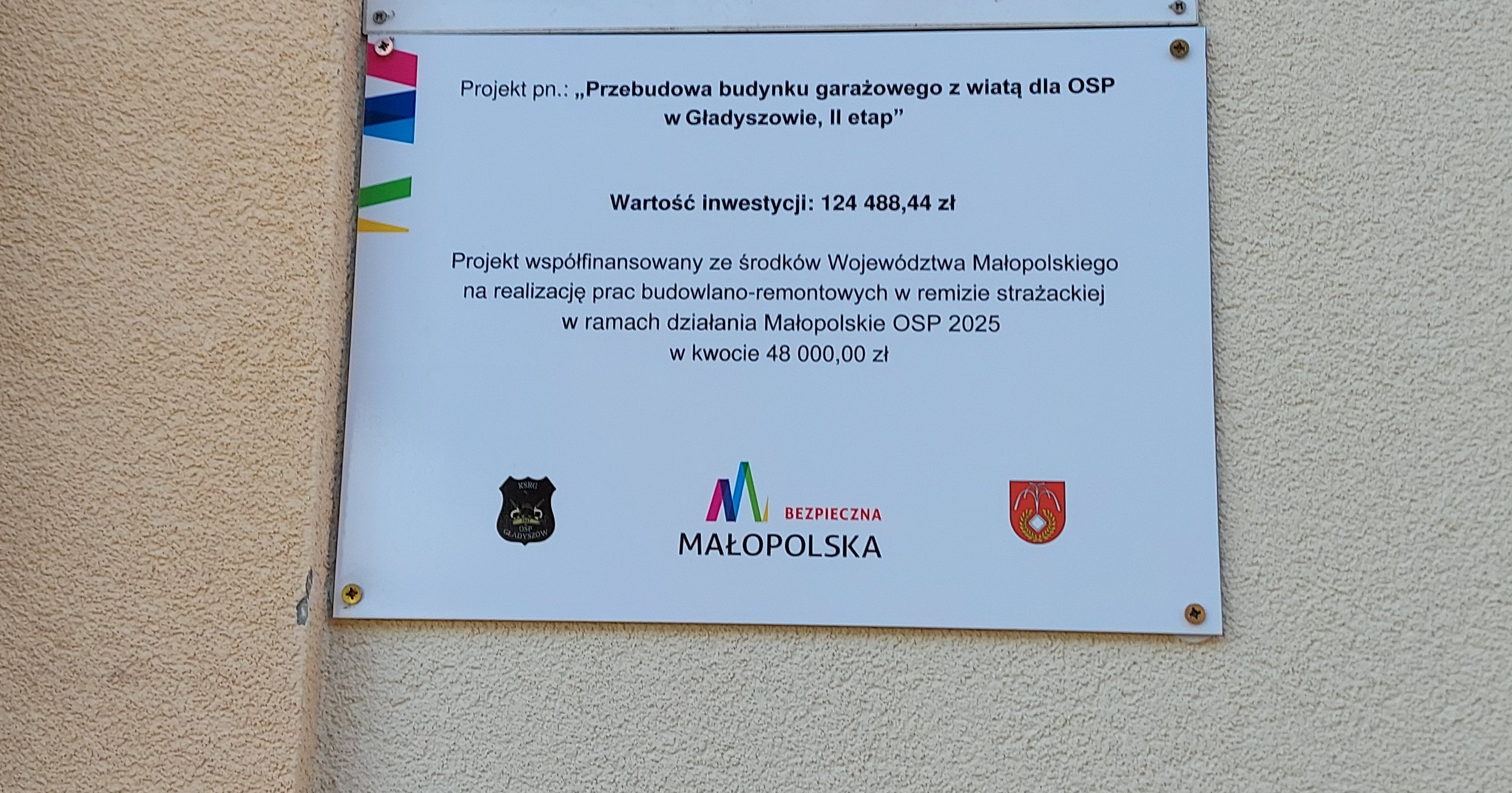 Inwestycja realizowana była w ramach zadania „Przebudowa budynku garażowego z wiatą dla OSP w Gładyszowie – II etap” i była współfinansowana ze środków Województwa Małopolskiego w ramach działania Małopolskie OSP 2025.
