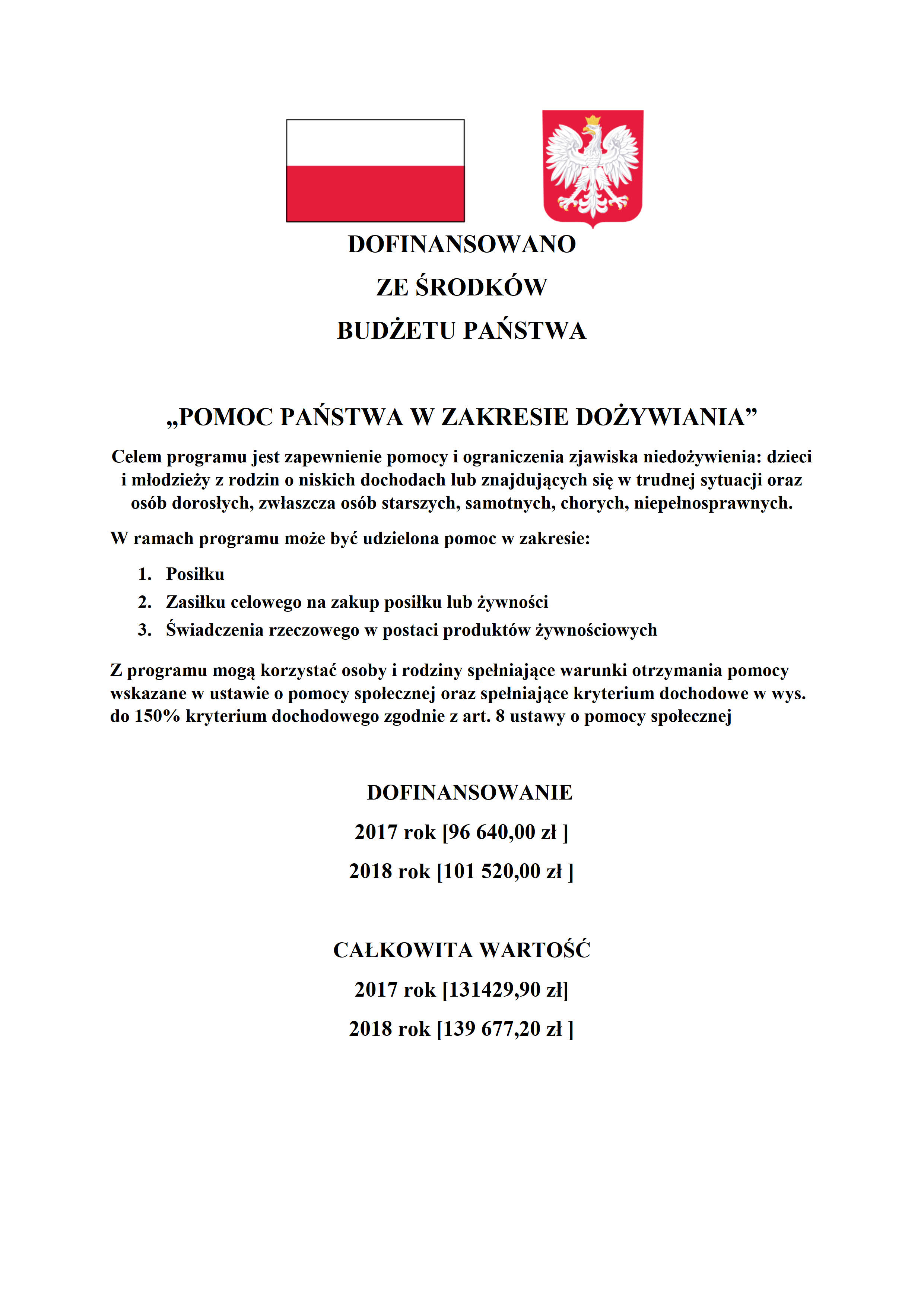 Celem programu jest zapewnienie pomocy i ograniczenia zjawiska niedożywienia: dzieci i młodzieży z rodzin o niskich dochodach lub znajdujących się w trudnej sytuacji oraz osób dorosłych, zwłaszcza osób starszych, samotnych, chorych, niepełnosprawnych.