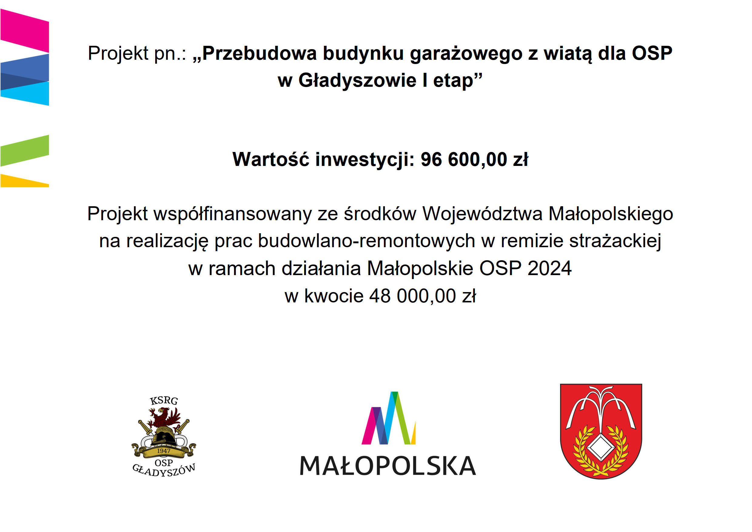 Projekt współfinansowany ze środków Województwa Małopolskiego na realizację prac budowlano-remontowych w remizie strażackiej w ramach działania Małopolskie OSP 2024 w kwocie 48 000,00 zł