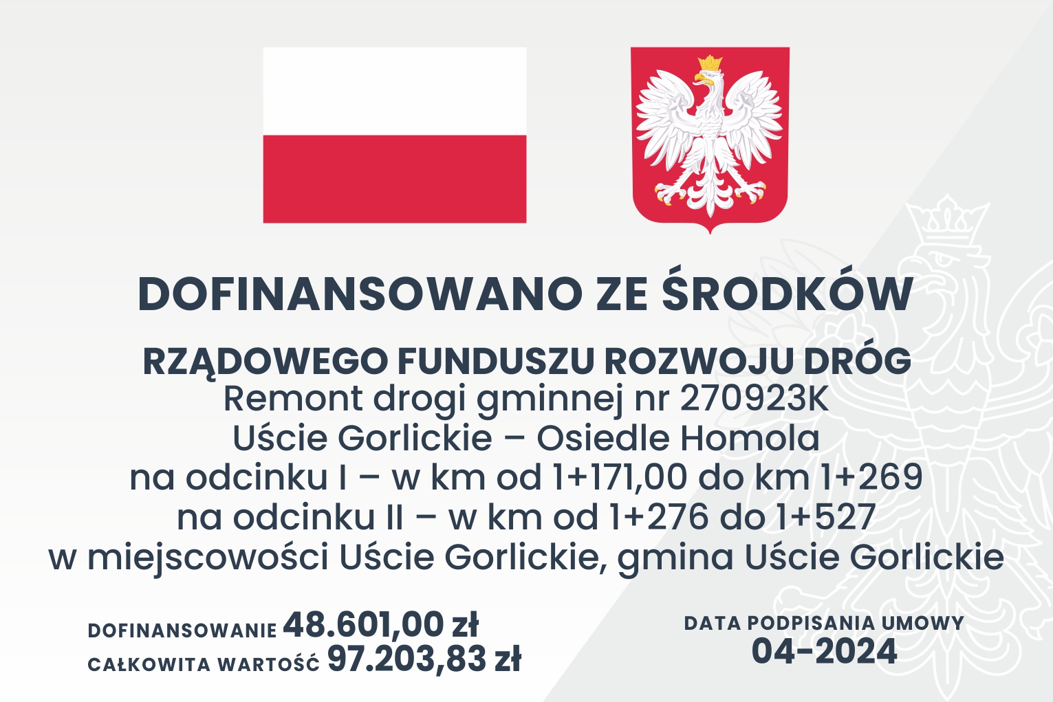 Gmina Uście Gorlickie realizuje zadanie polegające na wykonaniu nowej nawierzchni asfaltowej na dł. 349m. Celem projektu jest poprawa stanu technicznego infrastruktury drogowej dla polepszenia dostępności lokalnej społeczności do instytucji świadczących usługi publiczne w zakresie zdrowia, bezpieczeństwa, edukacji, opieki, administracji (POZ, Straż Pożarna, Policja, szkoła, przedszkole, urząd gminy) oraz pozostałych obiektów użyteczności publicznej (m.in. obiekty kultu religijnego, biblioteka i GOK). Remont realizowany jest w okresie 30.04. – 01.07.2024 r.