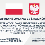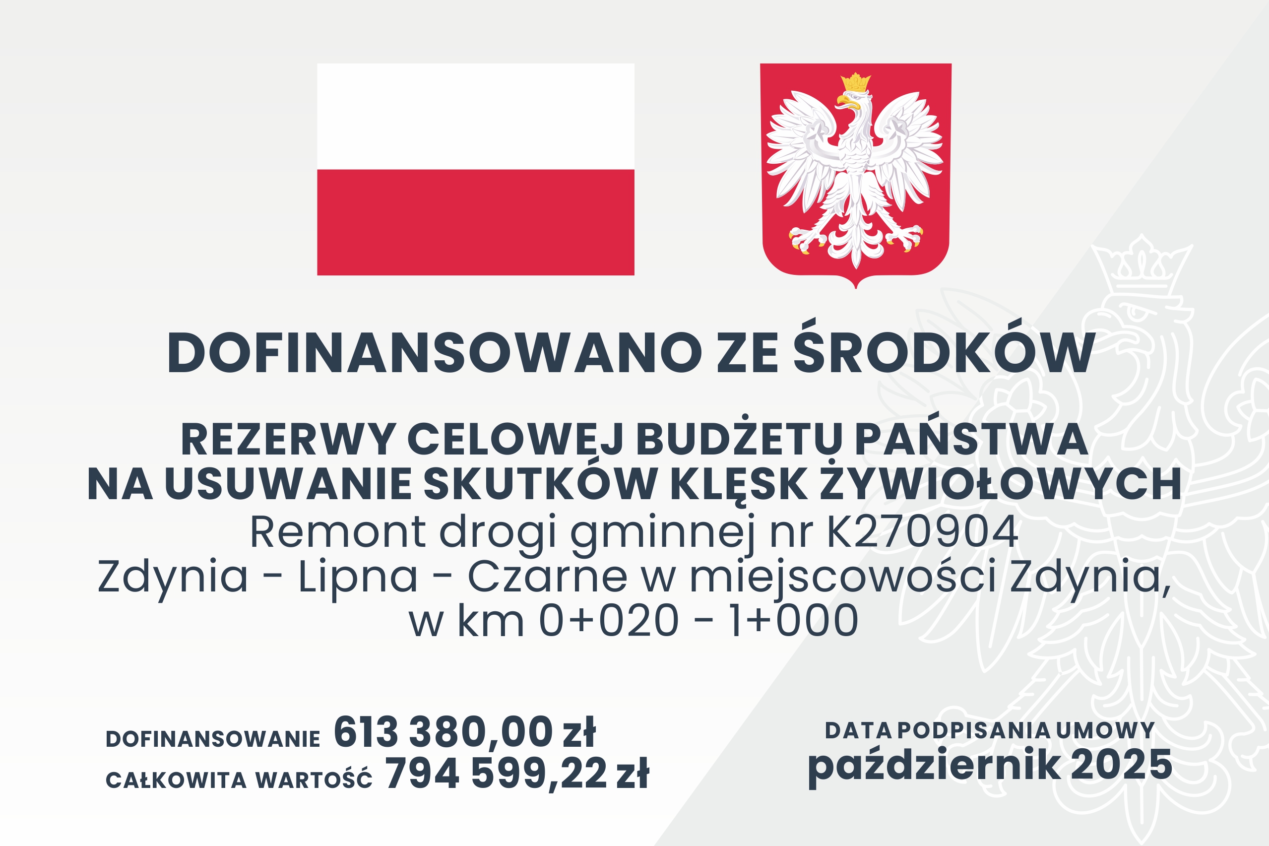 W ramach zadania związanego z usuwaniem skutków intensywnych opadów deszczu z 2025 roku na drodze publicznej gminnej Nr K270904 Zdynia – Lipna – Czarne wykonano nową nawierzchnię asfaltową na dł. 980m. Celem zadania była poprawa stanu technicznego infrastruktury drogowej dla polepszenia dostępności lokalnej społeczności do instytucji świadczących usługi publiczne w zakresie zdrowia, bezpieczeństwa, edukacji, opieki, administracji. Remont zrealizowano w okresie 28.10.2025 r. – 11.12.2025 r.