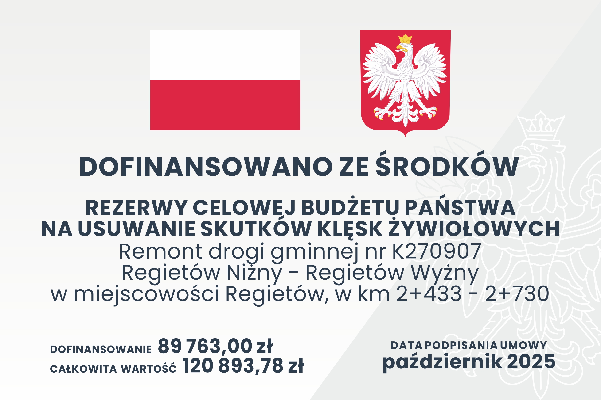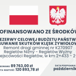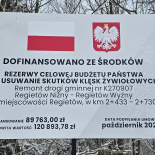 W ramach zadania związanego z usuwaniem skutków intensywnych opadów deszczu z 2025 roku na drodze publicznej gminnej Nr K270907 Regietów Niżny – Regietów Wyżny wykonano nową nawierzchnię asfaltową na dł. 297m. Celem zadania była poprawa stanu technicznego infrastruktury drogowej dla polepszenia dostępności lokalnej społeczności do instytucji świadczących usługi publiczne w zakresie zdrowia, bezpieczeństwa, edukacji, opieki, administracji. Remont zrealizowano w okresie 28.10.2025 r. – 11.12.2025 r.
