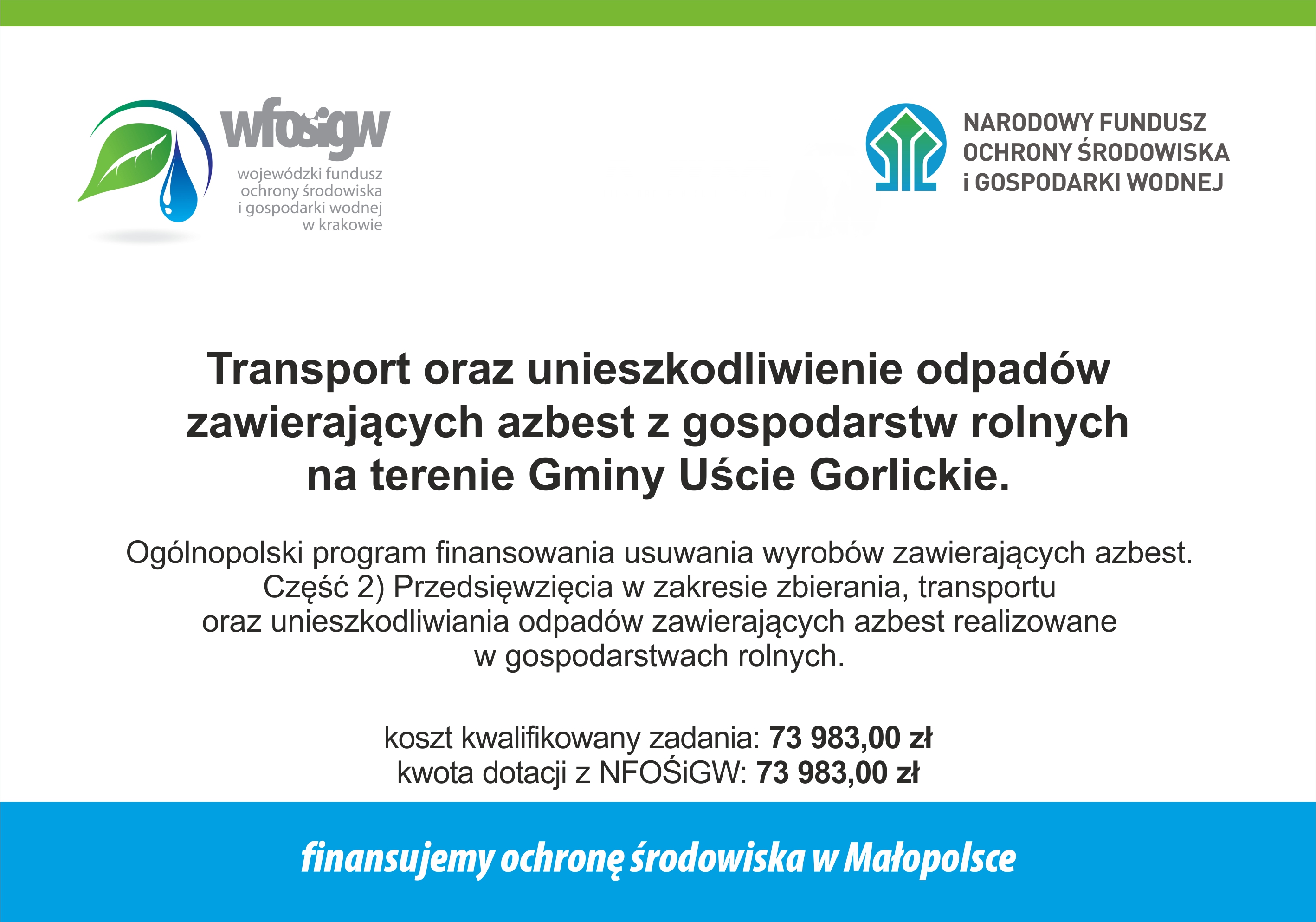 Zadanie zostało sfinansowane dzięki dotacji otrzymanej z Wojewódzkiego Funduszu Ochrony Środowiska i Gospodarki Wodnej w Krakowie w wysokości 73 983,00 zł.